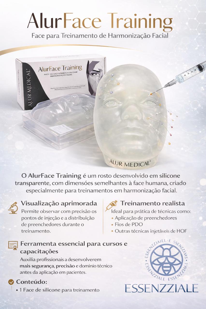 AlurFace Training é um rosto desenvolvido em silicone transparente com dimensões similares à face humana. Ela oferece uma visualização aprimorada que permite observar com precisão os pontos de injeção de preenchedores, aplicação de fios de PDO e outras técnicas injetáveis de harmonização orofacial (HOF).