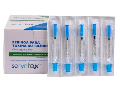 Seryntox de 0,5ml para reconstituição de 100u em 2ml em caixa com 100 unidades embaladas individualmente.